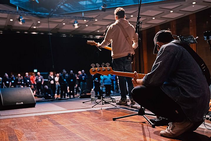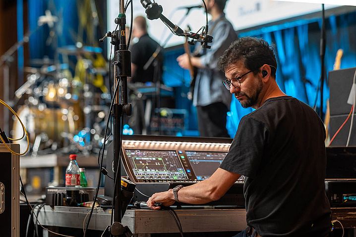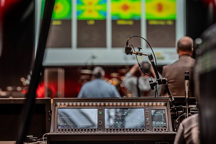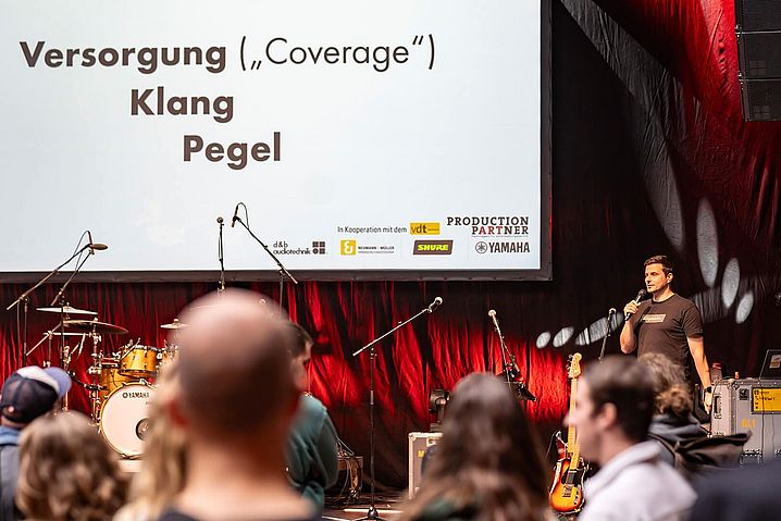 Observe professionals with many years of touring experience (Olli Voges und Nils Uhthoff) as they explain live what they are doing. Hear the results for yourself. Take a look over their shoulders. Stand next to the musicians on-stage and share their acoustic experience. Conduct experiments that are not possible during a normal gig.